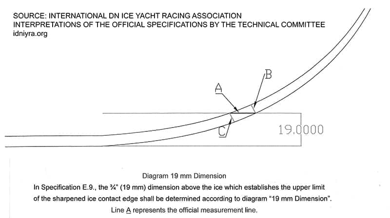 10/1/2010: In Specification E.9., the ¾” (19 mm) dimension above the ice which establishes the upper limit of the sharpened ice contact edge shall be determined according to the diagram “19 mm Dimension”. Line A represents the official measurement line.